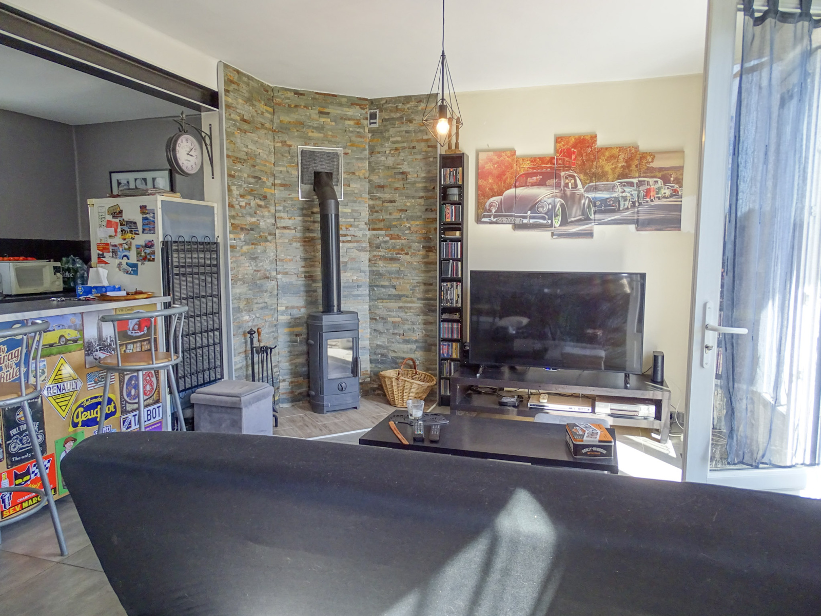 Elle se compose d’une spacieuse pièce de vie de 43 m² baignée de lumière, avec une cuisine aménagée ouverte sur le séjour, un poêle à bois apportant une touche de convivialité et une baie vitrée donnant sur une terrasse ensoleillée.