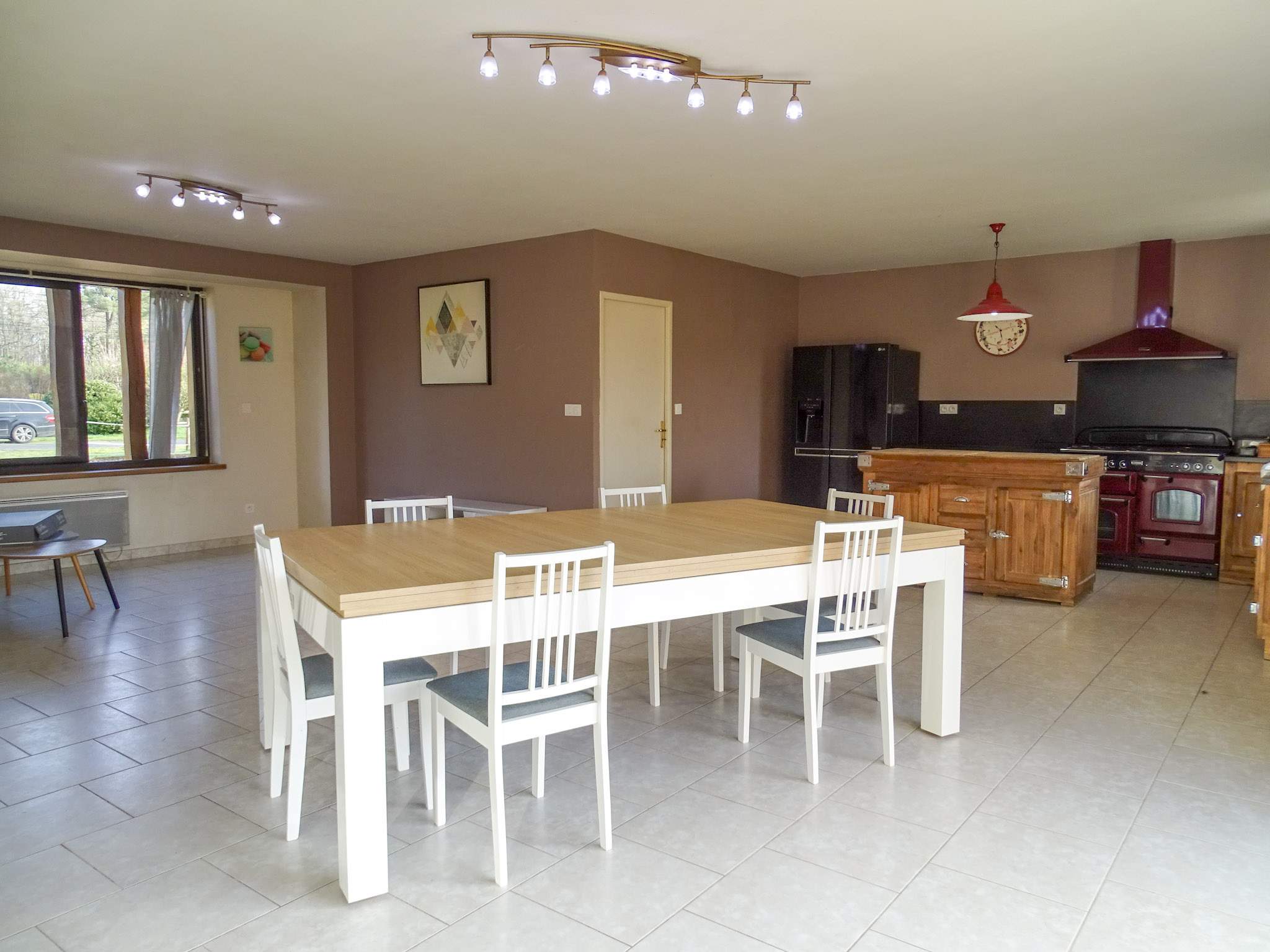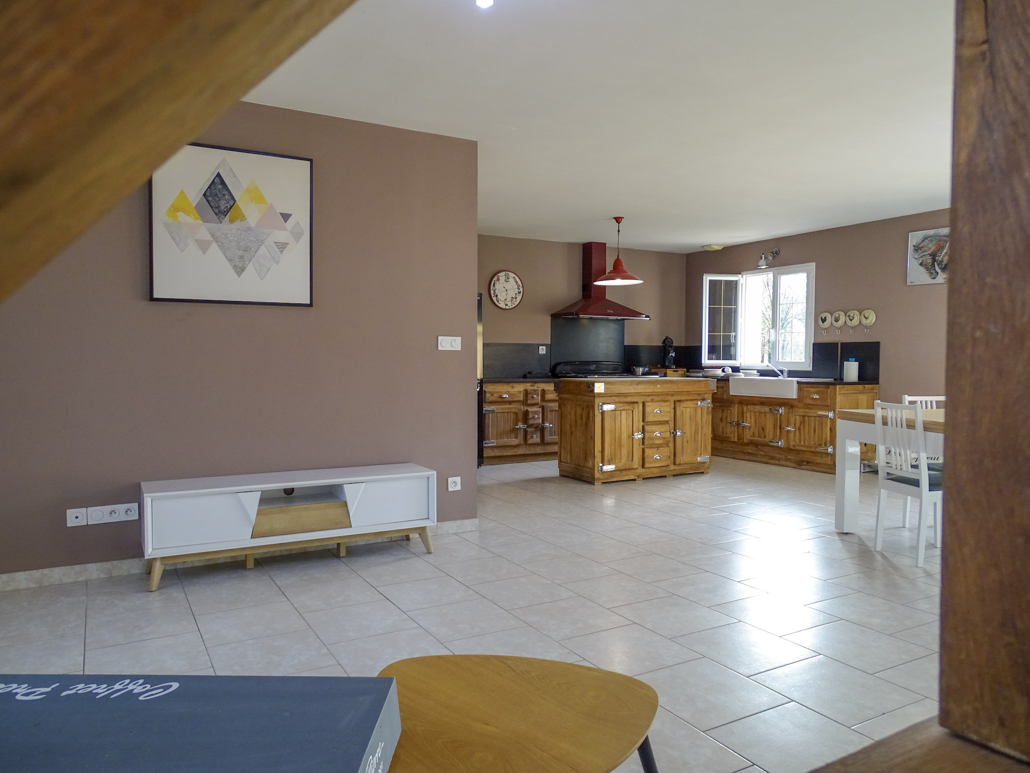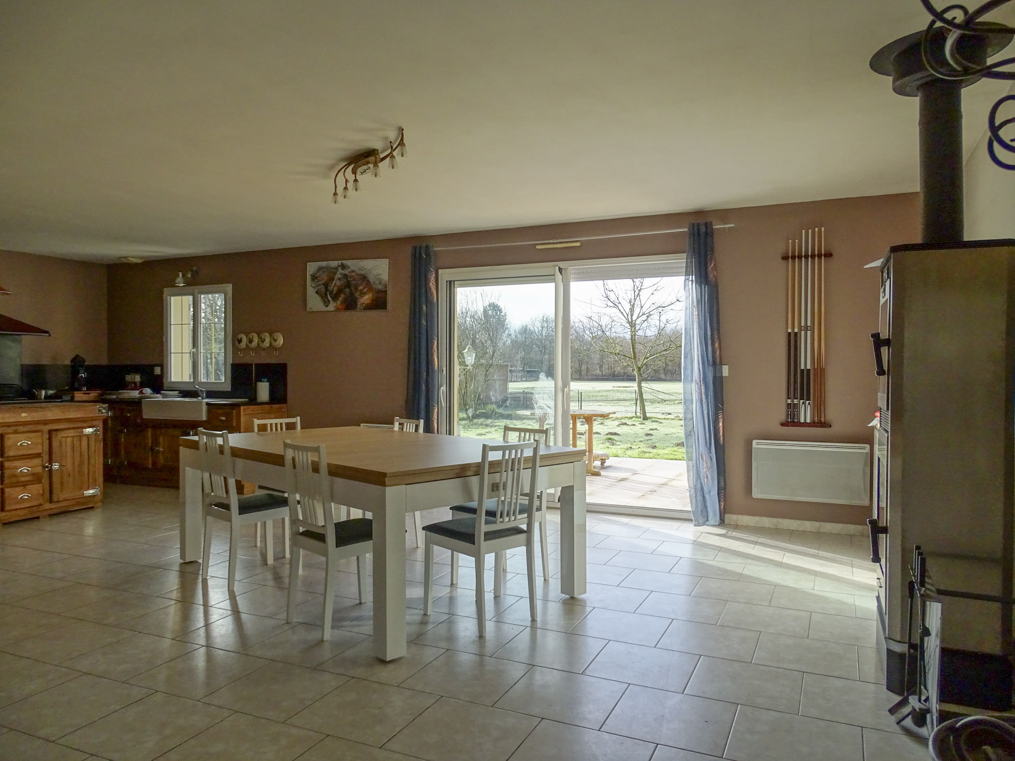 D’une superficie habitable de 117 m², la maison s’ouvre sur une vaste et lumineuse pièce de vie, où la cuisine aménagée et entièrement équipée se fond harmonieusement avec le séjour. Cet espace convivial est sublimé par un poêle à bois et de larges baies vitrées, offrant un accès direct à la terrasse et une belle ouverture sur l’extérieur.