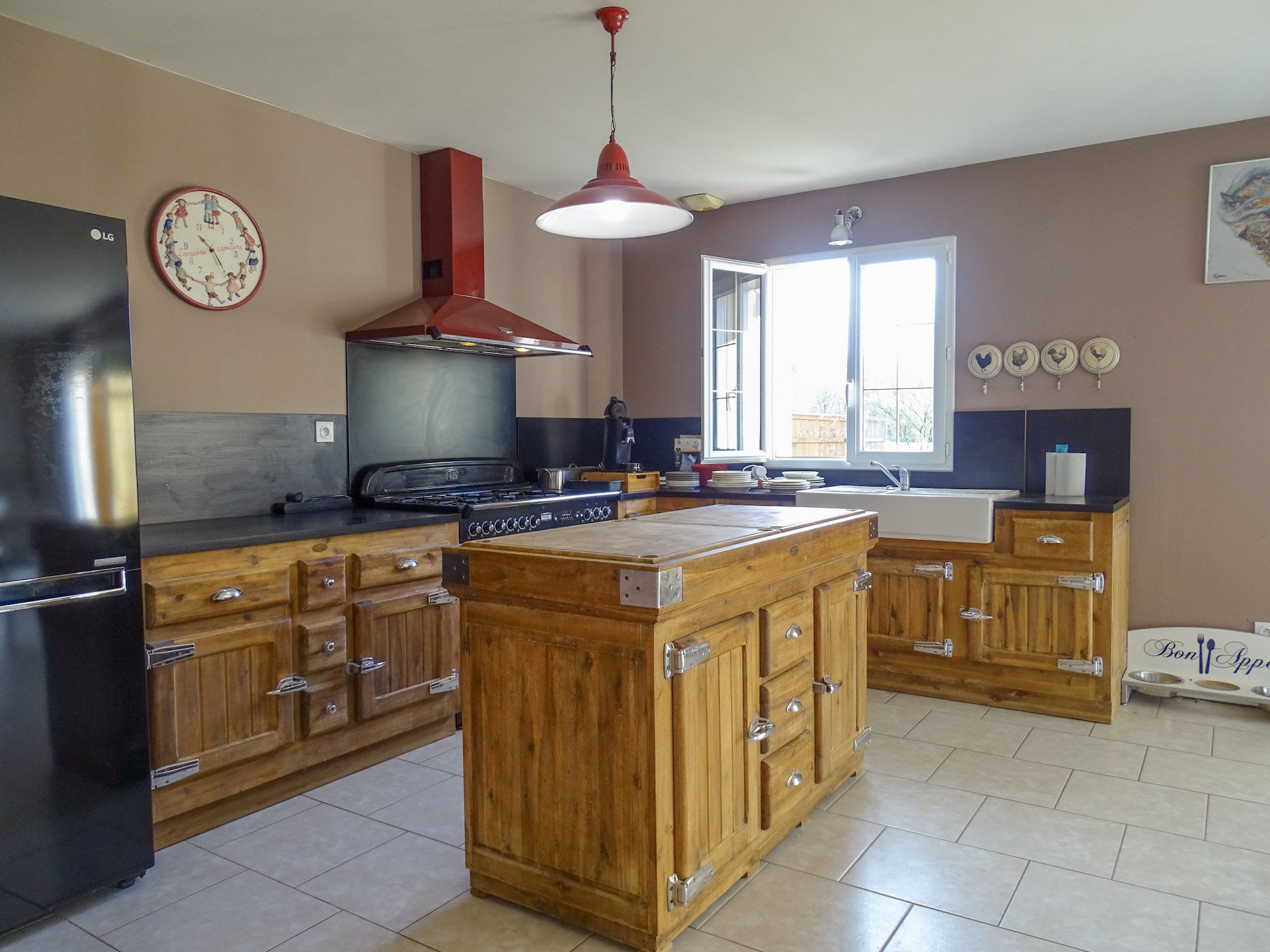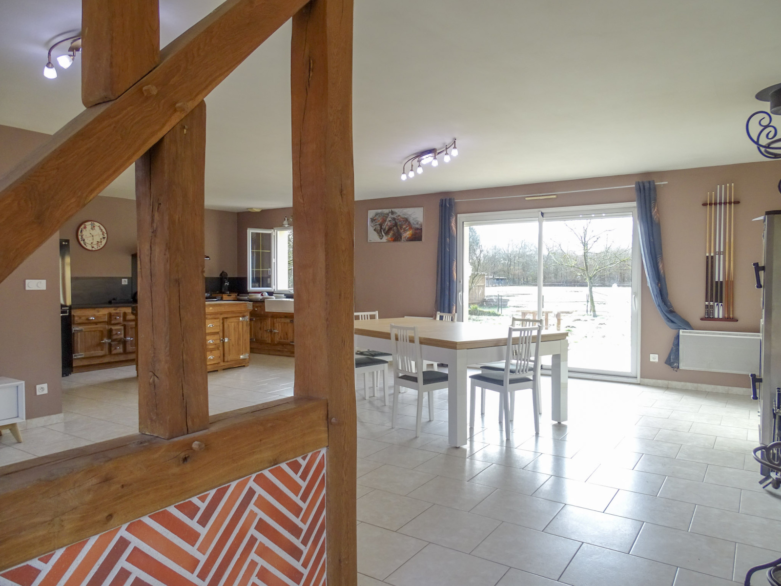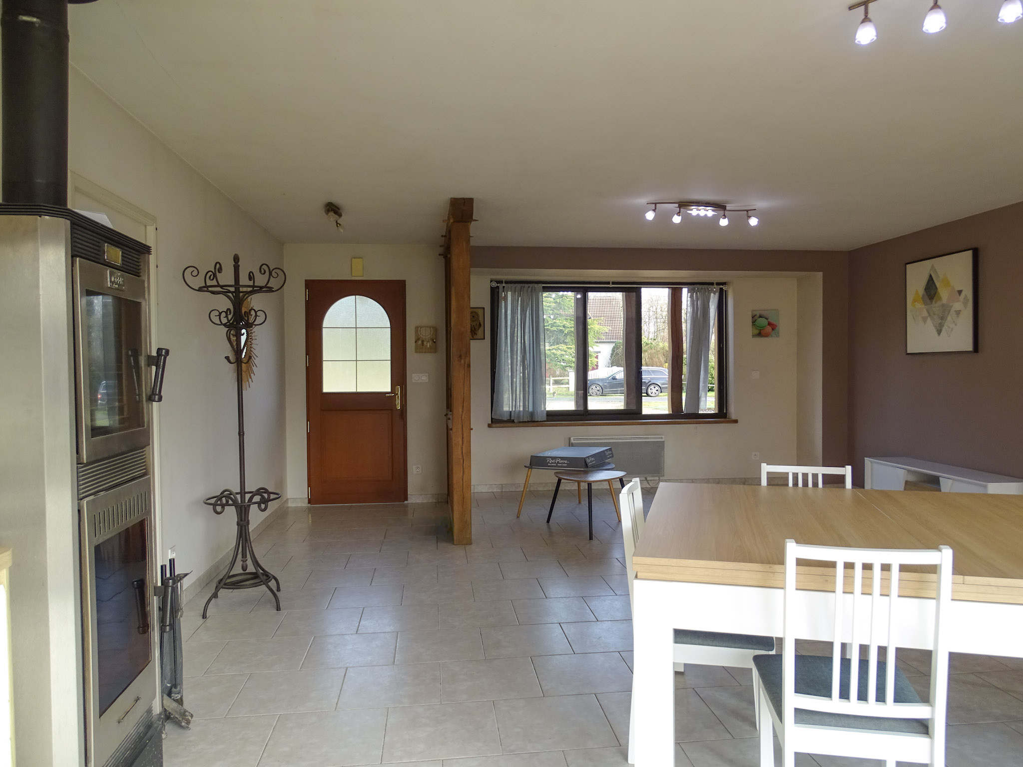 D’une superficie habitable de 117 m², la maison s’ouvre sur une vaste et lumineuse pièce de vie, où la cuisine aménagée et entièrement équipée se fond harmonieusement avec le séjour. Cet espace convivial est sublimé par un poêle à bois et de larges baies vitrées, offrant un accès direct à la terrasse et une belle ouverture sur l’extérieur.