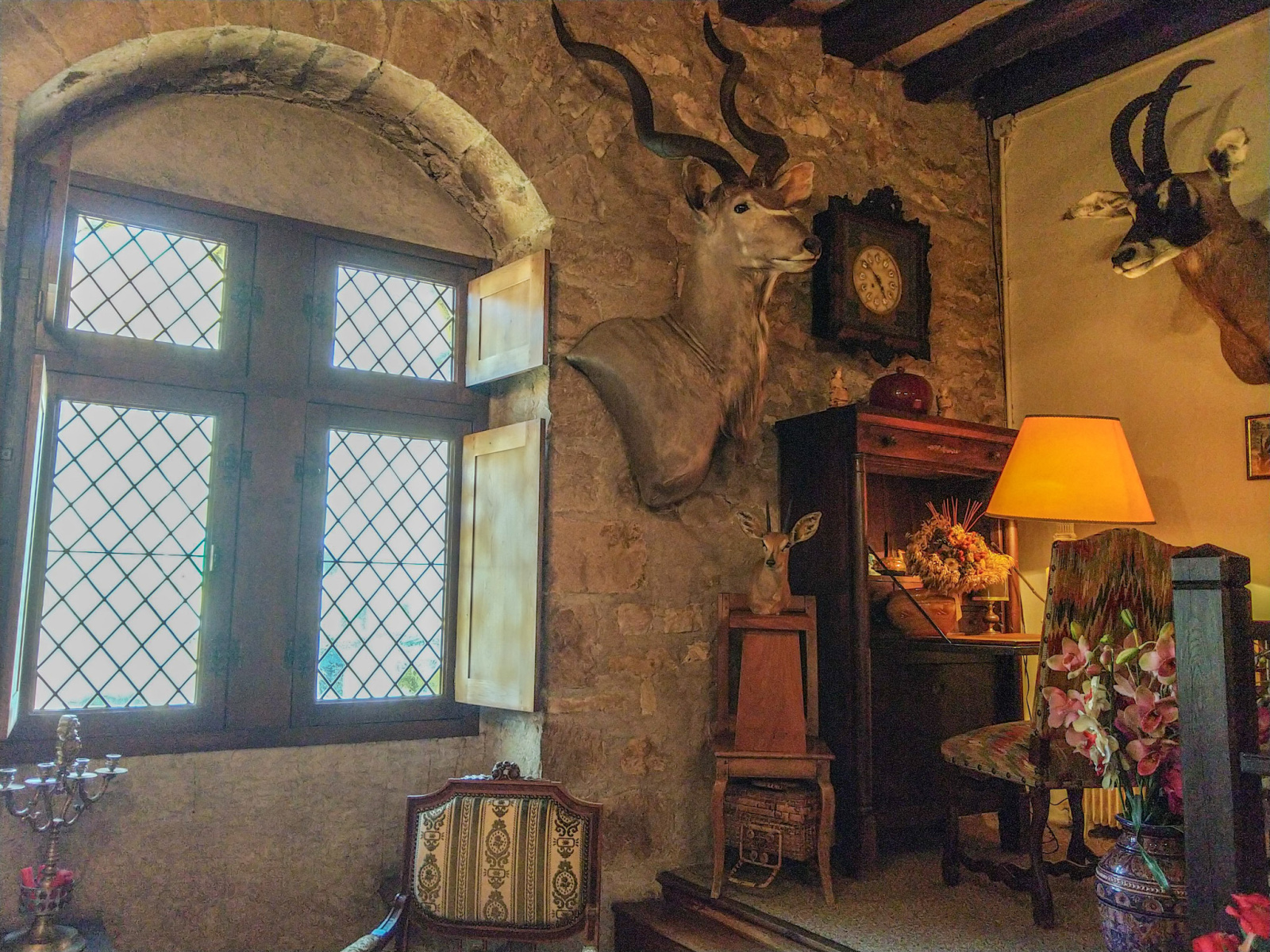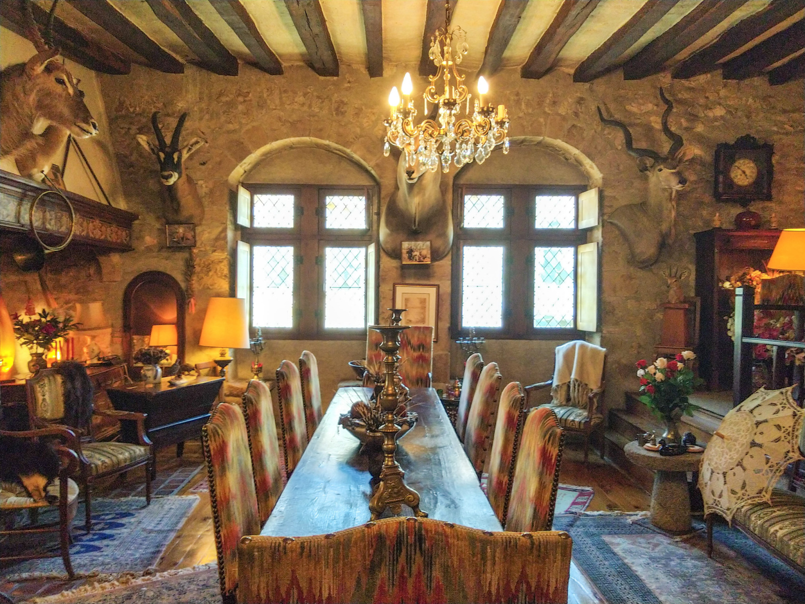 Au rez-de-chaussée une entrée avec son escalier en véritables pavés donnant sur une vaste pièce de vie de 57 m² éclairée par ses fenêtres gothiques et vitraux artisanaux et arborant sa majestueuse cheminée de pierres et boiseries sculptées, une cuisine aménagée et salle à manger de 42 m² avec sa cheminée, un passage tamisé par sa fenêtre à vitraux donne sur une cour intérieure et permet l’accès à une vaste chambre d’amis aménagée de son lit pont d’époque, une chambre parentale, une salle de douches aménagée et sa baignoire d'angle, une suite comprenant une grande chambre avec cheminée et une salle d’eau, une salle d’attente, un bureau et cabinet de toilettes pour une profession libérale.