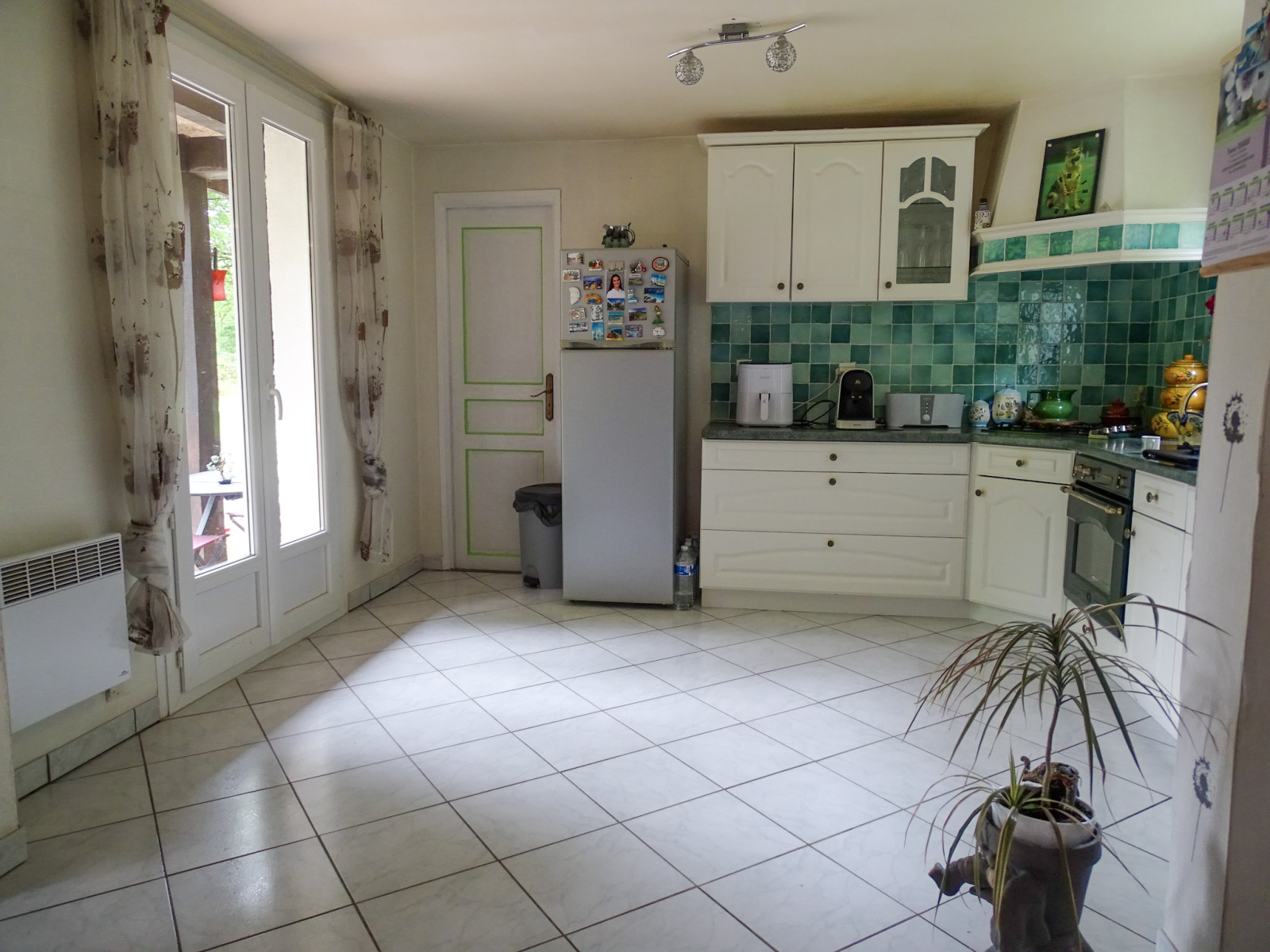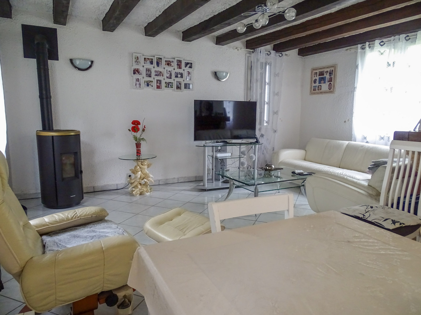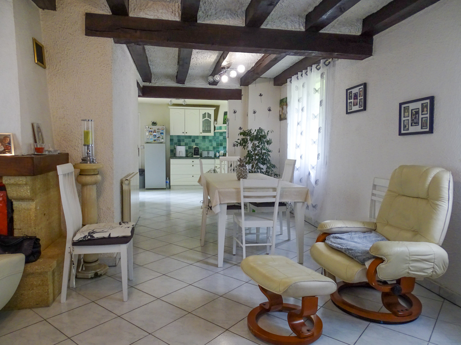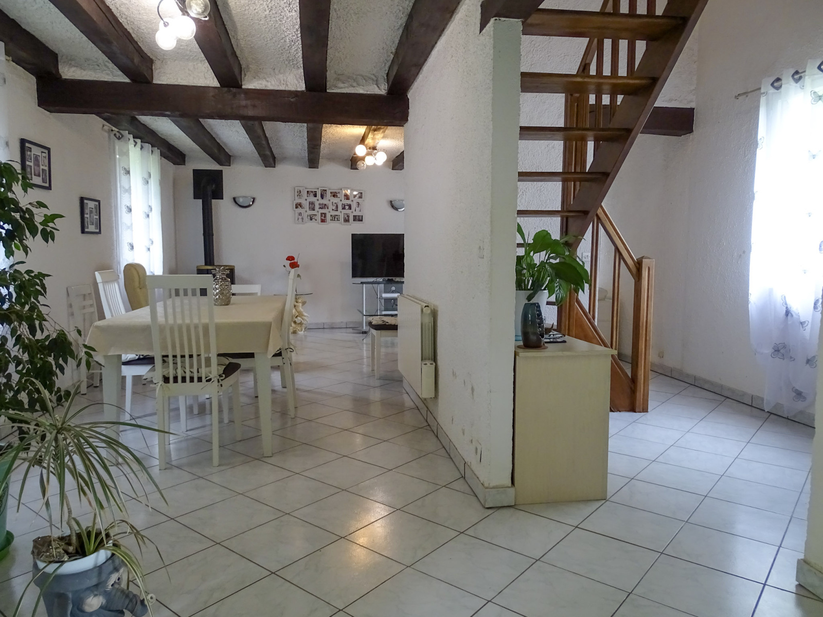 Au rez-de-chaussée, une entrée dessert une cuisine aménagée, ouverte sur une pièce de vie agrémentée d’un poêle à granulés pour des hivers doux et confortables.