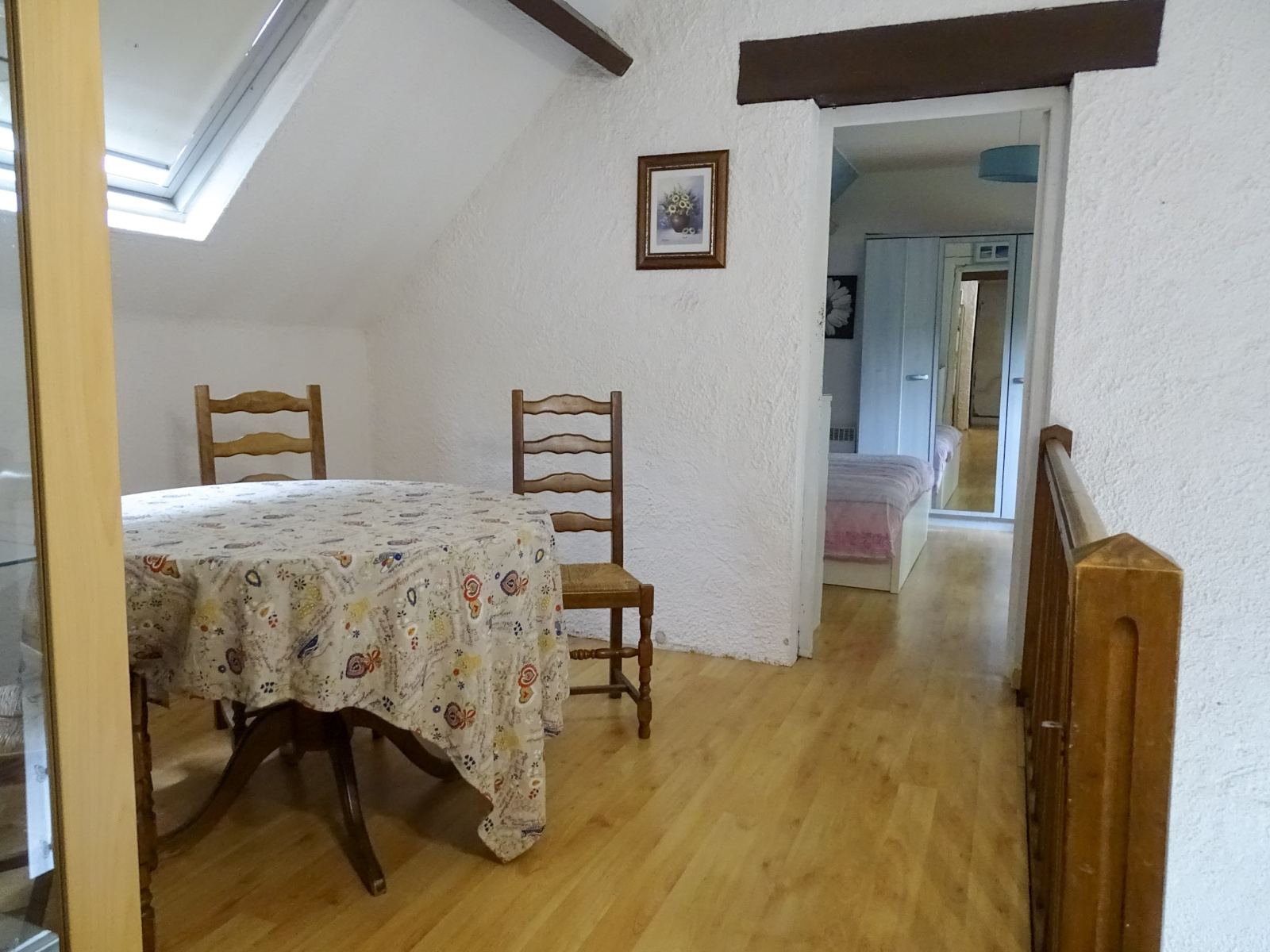 À l’étage, une mezzanine distribue deux chambres ainsi qu’une salle de bains.