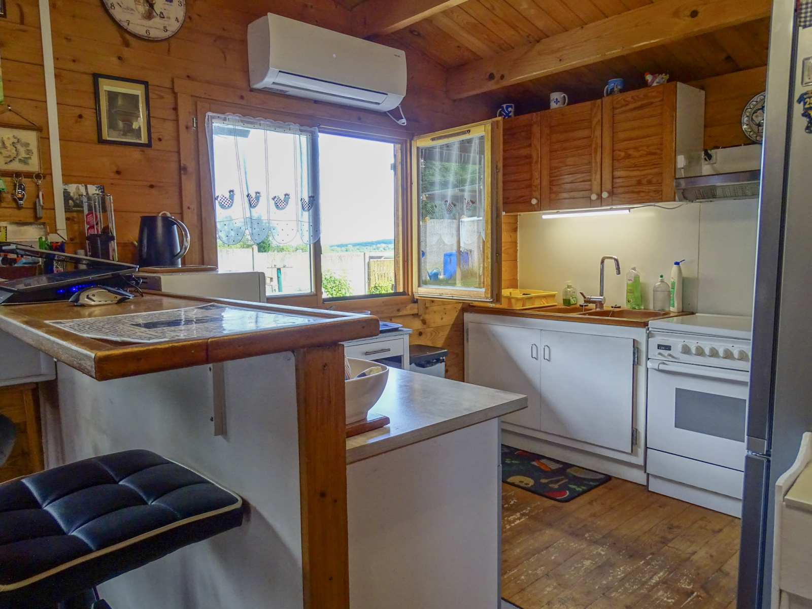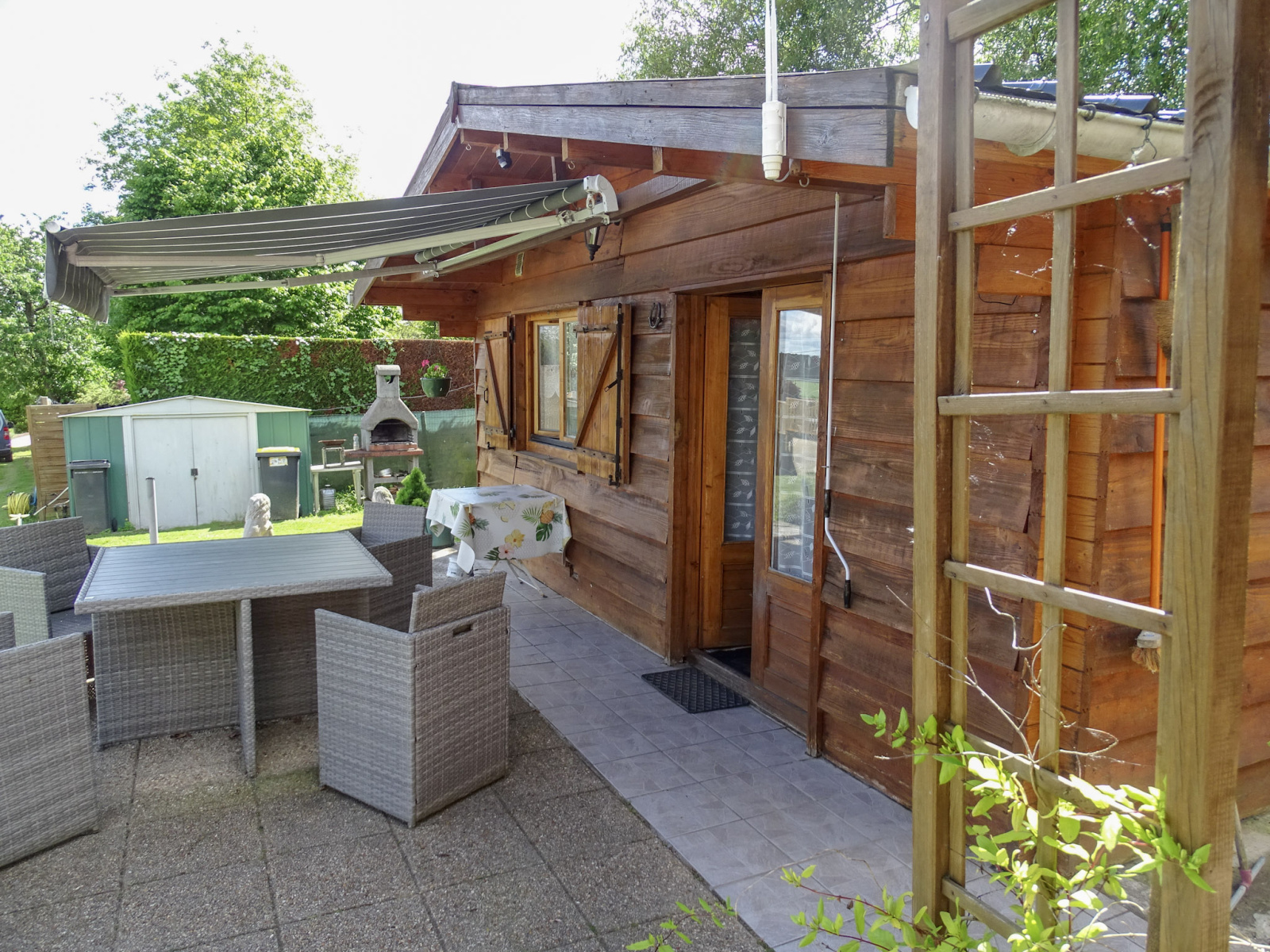Le premier chalet inclut une cuisine aménagée ouverte sur la pièce de vie donnant sur une agréable terrasse invitant à des déjeuners ensoleillés, et une salle d'eau. Pour plus de confort, vous bénéficierez également du double-vitrage et d'une climatisation réversible.