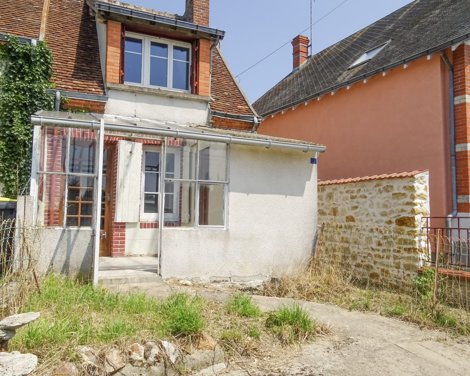 L'ensemble avec une cour en façade, véranda vintage et un terrain sur l'arrière.