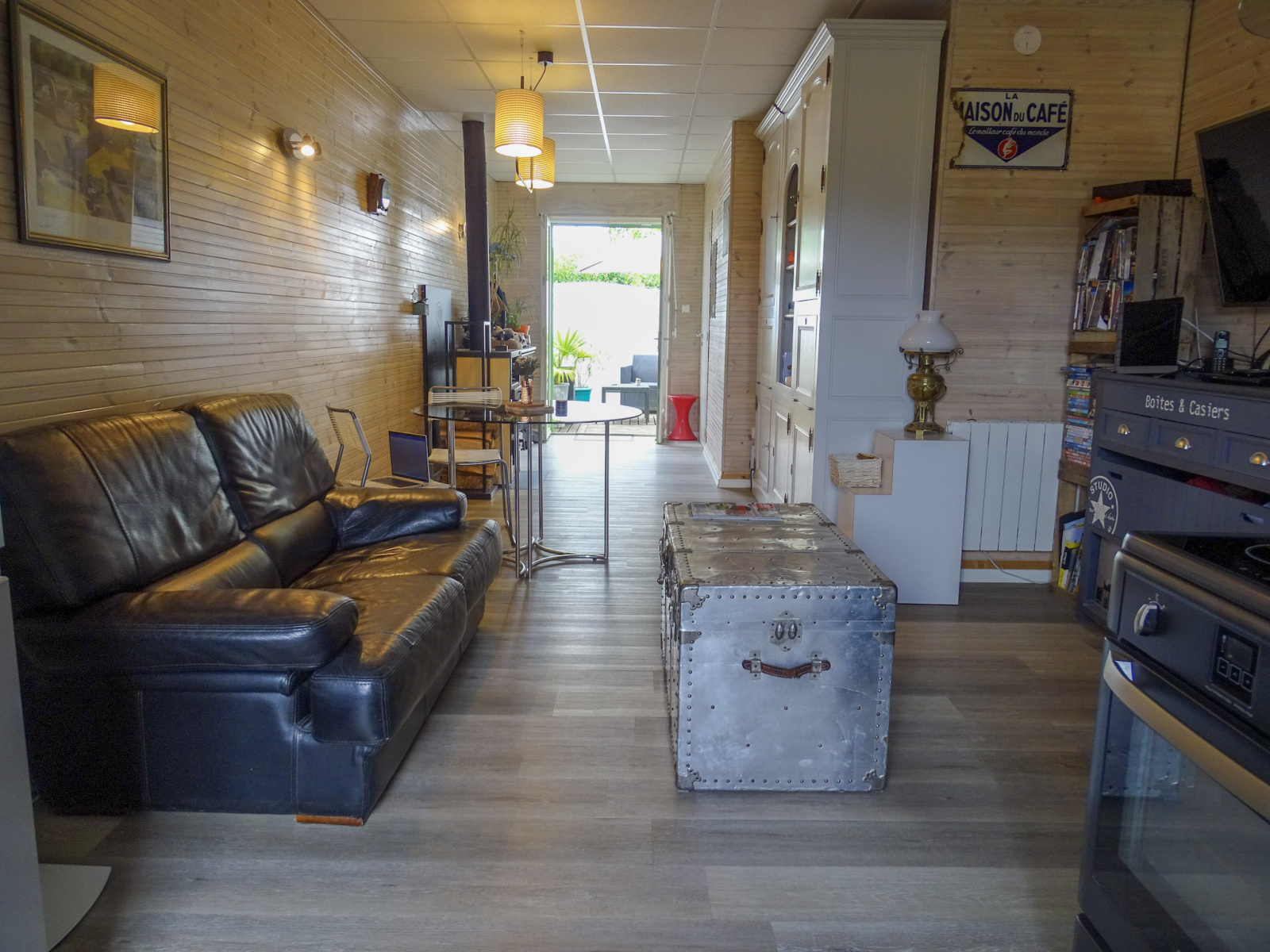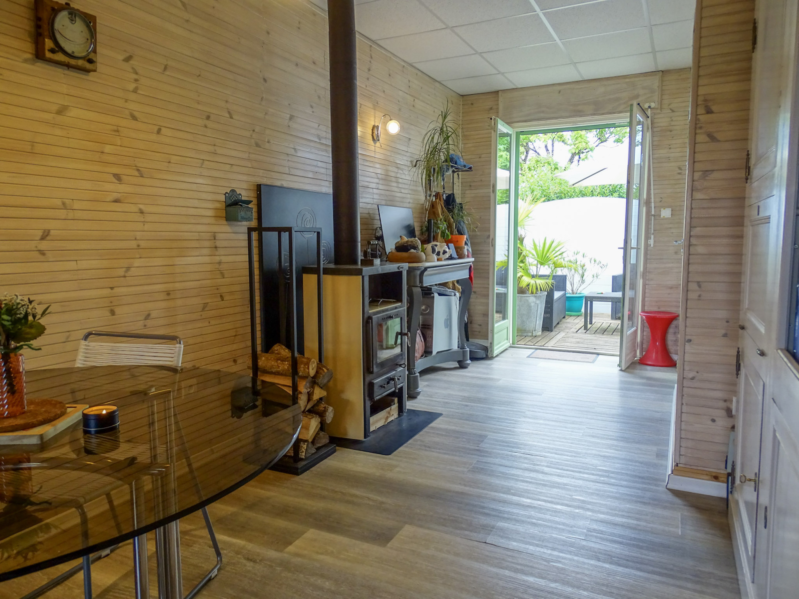 Elle se compose d'une entrée ouvrant sur une vaste pièce de 43 m², modulable selon vos besoins, ainsi que d’une pièce de vie conviviale avec poêle à bois et porte-fenêtre donnant sur une terrasse à l'abri des regards.
